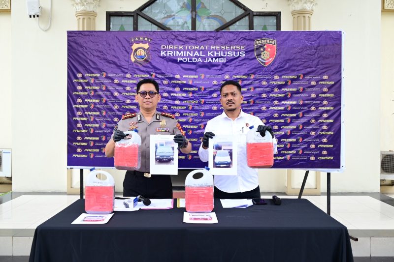 Konferensi pers tersebut dipimpin oleh Kabid Humas Polda Jambi Kombes Pol. Erlan Munaji dengan di dampingi oleh Kasubdit IV Tipidter Ditreskrimsus Polda Jambi AKBP Hadi Handoko.