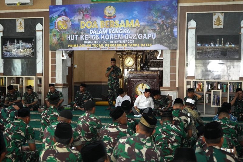 Jambi – Dalam suasana penuh kebersamaan dan rasa syukur, Korem 042/Gapu menggelar acara syukuran Hari Ulang Tahun ke-66, bertempat di Masjid At-Taqwa Makorem 042/Gapu, Jambi. Acara tersebut dipimpin oleh Kasipers Kasrem 042/Gapu Kolonel Arh Agus Setiawan, S.T., mewakili Danrem 042/Gapu Brigjen TNI Heri Purwanto, S.E., M.Sc.