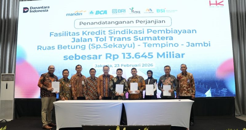 JAKARTA – PT Hutama Karya (Persero) (Hutama Karya) menandatangani Perjanjian Fasilitas Kredit dari Sindikasi Perbankan untuk Pembiayaan Pembangunan Jalan Tol Trans Sumatera (JTTS) ruas Betung (Sp. Sekayu) – Tempino – Jambi. Penandatanganan ini merupakan langkah strategis untuk memperkuat struktur pendanaan proyek, sehingga pelaksanaan pembangunan dapat berjalan berkesinambungan sesuai rencana. Acara penandatanganan diselenggarakan pada Senin (23/02) di Ballroom HK Tower, Jakarta.