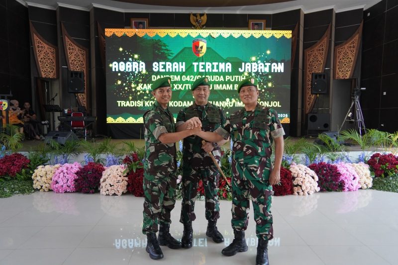 Padang, Sumatera Barat – Panglima Kodam XX/TIB Mayjen TNI Arief Gajah Mada, S.E., M.M., memimpin langsung upacara serah terima jabatan Komandan Korem 042/Garuda Putih dari Brigjen TNI Heri Purwanto, S.E., M.Sc., kepada Kolonel Inf Nyamin, S.I.P., M.M., bertempat di Makodam XX/TIB, Padang, Sumatera Barat, Senin (26/01/2026).