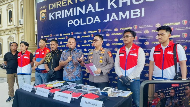 Jambi – Polda Jambi menggelar konferensi pers terkait pengungkapan dugaan tindak pidana di bidang minyak dan gas (migas) yang terjadi di wilayah Kabupaten Bungo, pada Jumat (10/4/2026)