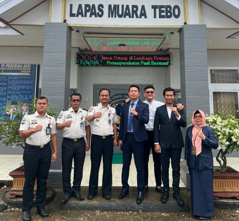 TEBO – Lembaga Pemasyarakatan (Lapas) Kelas IIB Muara Tebo menerima kunjungan Hakim Pengawas dan Pengamat (Wasmat) dari Pengadilan Negeri Tebo pada Selasa (21/04/2026), bertempat di Lapas Muara Tebo. Kegiatan tersebut disambut langsung oleh Kepala Lapas Muara Tebo, Mukhlisin Fardi, didampingi Kasi Binadik dan Giatja, Erison Bangun, serta Plh. Kasubsi Registrasi, Ivan Aditya.