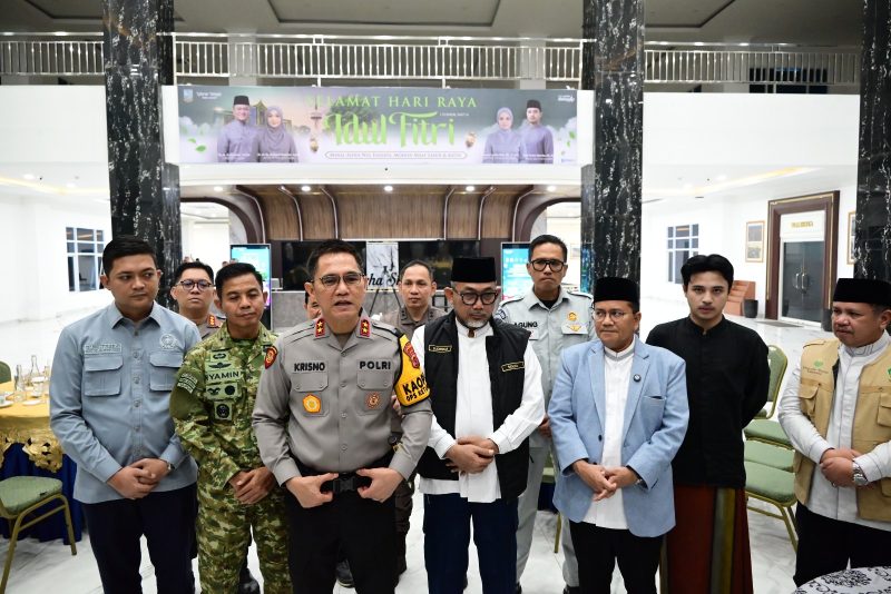 KOTAJAMBI – Kapolda Jambi Irjen Pol Krisno H Siregar bersama Danrem 042 Gapu Brigjen TNI Nyamin, Ketua DPRD Provinsi Jambi M Hafiz Fattah, Sekda Provinsi Jambi Dr H Sudirman, Wakapolda Jambi Brigjen Pol Benny Ali, Walikota Jambi Dr dr H Maulana, Wawako Diza Kejaksaan Tinggi dan Jasa Raharja mengikuti zoom secara Nasional dalam rangka pemantauan Sitkamtibmas Malam Takbiran Menjelang Hari Raya Idul Fitri 1447 H/2026 M, Jumat malam (20/3/2026).