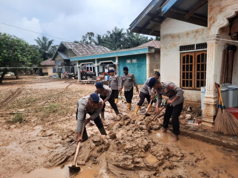 “Para Personel Batalyon B Pelopor melaksanakan Pembersihan Sisa-sisa Lumpur di Rumah Warga Pasca Banjir di Desa Teluk Kecimbung Kec. Bathin VIII Sarolangun,” ujarnya.