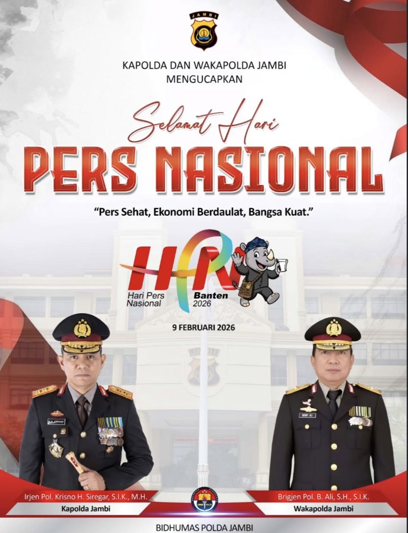 JAMBI – Dalam rangka menyongsong Hari Pers Nasional (HPN) 2026, Polda Jambi menyampaikan apresiasi kepada seluruh insan pers yang selama ini berperan aktif menghadirkan informasi yang terpercaya, mendidik, dan menyejukkan bagi masyarakat.