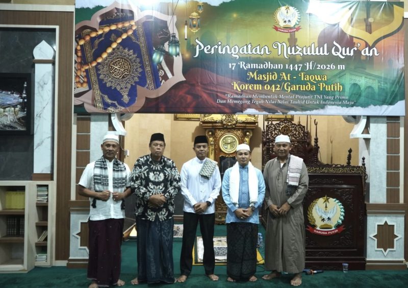 Jambi – Korem 042/Gapu menggelar peringatan Nuzulul Quran 17 Ramadhan 1447 H/2026 M di Masjid At-Taqwa Korem 042/Gapu, yang dihadiri langsung oleh Danrem 042/Gapu Kolonel Inf Nyamin, S.I.P., M.M., para Pejabat Utama Korem, Ketua Persit KCK Koorcab Rem 042 PD XX/TIB beserta pengurus, dalam suasana khidmat dan penuh kebersamaan di bulan suci Ramadan, Jum’at (6/3/2026).