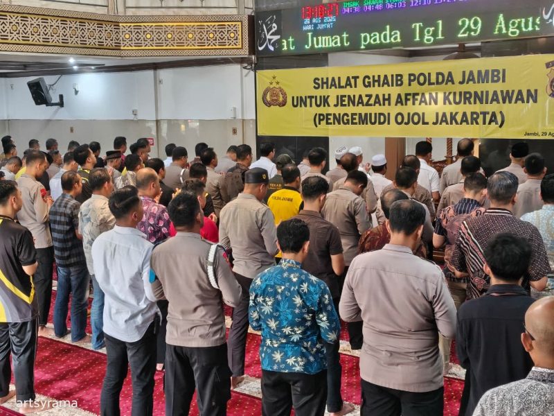 JAMBI – Sebagai wujud belasungkawa dan kepedulian terhadap korban aksi unjuk rasa di Jakarta yang menimpa pengemudi ojek online (ojol), Polda Jambi menggelar Sholat Ghaib di Masjid Al-Ikhlas Polda Jambi usai pelaksanaan Sholat Jumat berjamaah, Jumat (29/8/25).