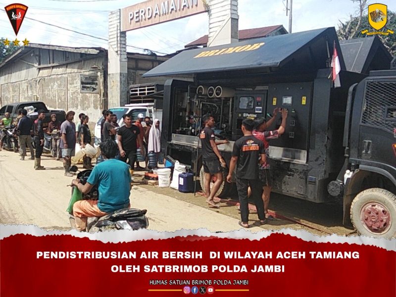 ACEH TAMIANG – Sebagai bentuk kepedulian dan dalam rangka membantu masyarakat yang terdampak bencana alam di Aceh Tamiang, Satuan Brimob Polda Jambi mendistribusikan air bersih, Minggu (07/12/2025).